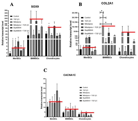 The effect of nifedipine and BayK8644 on chondrogenic differentiation-related genes in MenSCs, BMMSCs and chondrocytes. The expression of SOX9 (A), COL2A1 (B) and CACNA1C (C) after the stimulation of chondrogenic differentiation for the 21 days with TGF-β3 (10 ng/mL), nifedipine (10 μM) or BayK8644 (10 μM). Control cells were cultured under the same chondrogenic differentiation conditions, but without TGF-β3, nifedipine or BayK8644. Relative transcript level evaluated according to the housekeeping genes B2M and RPS9. Red lines represent the gene expression after the TGF-β3 stimulation. Data are shown as mean ± standard deviation (SD) and were significant at * p ≤ 0.05.