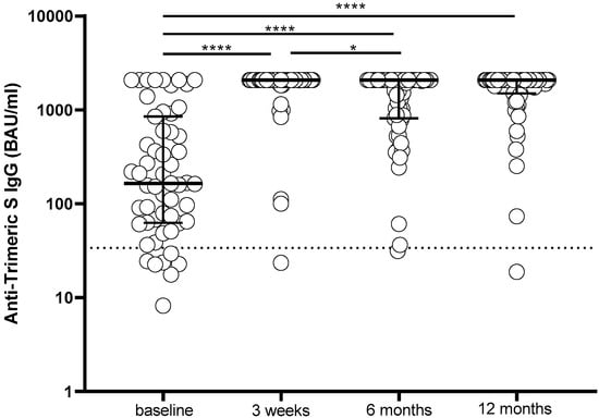 Anti-trimeric S IgG levels elicited in 55 patients by the third dose of the BNT162b2 vaccine measured at the time of administration of the third dose (baseline) and 3 weeks, 6 months and 12 months after the third dose. IgG, immunoglobulin G; S, spike; **** p < 0.0001; * p < 0.05.