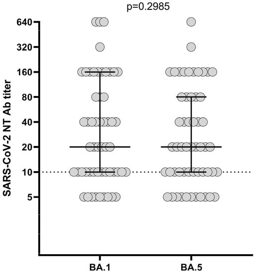 The SARS-CoV-2 NT Ab titer measured 12 months after the third dose was measured against BA.1 and BA.5 VOCs. The median level of the NT Ab titer was not statistically different between the two VOCs (observed against the Omicron variant at T3 (1:20, IQR 1:10–1:160 vs. 1:20, IQR 1:10–1:80; p > 0.2985)). Only 9/55 (16.4%) and 11/55 (20%) patients tested negative for BA.1 and BA.5, respectively (Figure 2).