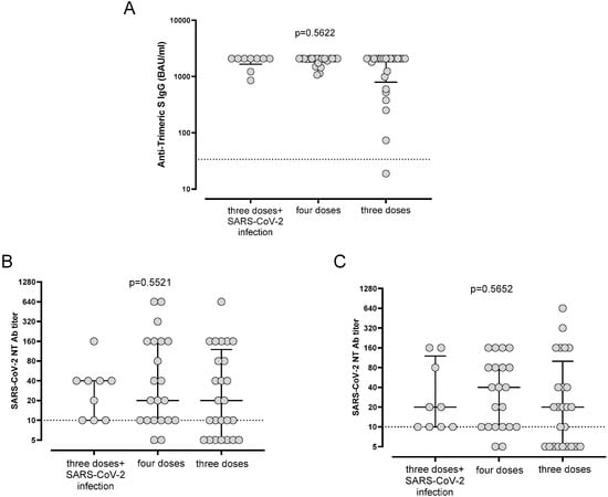 The potential impact of a breakthrough SARS-CoV-2 infection was also analyzed in our cohort. Although all patients experiencing a SARS-CoV-2 infection after three doses of the vaccine showed a positive NT Ab titer against the two VOCs analyzed, no significant differences in terms of the median level of response were observed in comparison with patients who did not experience a SARS-CoV-2 infection or patients vaccinated with four doses of the BNT162b2 vaccine. In our previous paper [], we confirmed the benefit of a fourth dose, particularly in terms of enhanced neutralizing activity against the BA.1 variant, with a significant difference between baseline and 3 weeks after the fourth dose. So far, the immunogenicity of the fourth mRNA vaccine dose is in line with previous studies [].