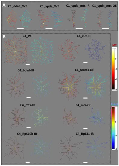 In this study, we quantified neuronal morphology simultaneously with the cytoskeletal distributions from a diverse set of cell classes and mutated phenotypes. The studied mutations included RNAi knockdowns and overexpression of specific genes. The transcription factor cut promotes F-actin dynamics by exerting combinatorial regulation through downstream effector molecules []. Cut positively regulates bdwf expression, which encodes a protein that regulates proportional growth and branching of dendritic arbors []. Overexpression of bdwf in turn downregulates cut expression in da neurons. Both bdwf-IR and bdwf-OE phenotypes demonstrate branching defects with reduced arbor size and complexity in both Class I and Class IV neuron types. The ribosomal proteins RpS24, RpL4, RpL22, and RpL31 are physical interactors of bdwf. Similar to bdwf-IR, knockdown of any of these four proteins leads to a reduction in dendritic complexity, as well as a reduction in average cytoskeletal distributions []. Another downstream effector molecule of cut-mediated transcriptional regulation is PP2A phosphatase. Overexpression and knockdown of PP2A’s catalytic subunit mts demonstrates that PP2A homeostatically promotes the dendritic development of Class IV and restricts Class I branching, respectively. Both microtubule stability and F-actin organization are regulated by mts as well. Knockdown of mts leads to reduced complexity in Class IV and increases in short branches in Class I da neurons. Overexpression of mts leads to reduced complexity in both Class I and Class IV da neurons []. Another regulator of cytoskeletal organization is formin3 or form3, which increases dendritic arbor complexity. Form3 also promotes maintenance of stable microtubule fibers in the dendrites. RNAi knockdown of form3 reduces overall dendritic length and complexity. Overexpression of form3 promotes exuberant terminal dendritic branching, coupled to a proximal shift in branching and cytoskeletal distributions []. Knockdown of three additional ribosomal proteins, RpL17, RpL35A, and RpS10b, causes morphological and cytoskeletal defects in da neuron architecture (Figure 1, Figure 6 and Figure 7, and Supplementary Materials Table S1). While all the studied mutations affect the organization, stability, and dynamics of the cytoskeleton, in this study we find that the influence of the cytoskeletal molecules over geometry remains consistent across classes and genetic manipulations.