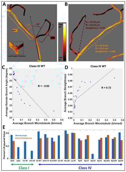 In order to estimate the relative influence of cytoskeletal composition over spatial geometry, we measured the angular deviation (Figure 2A) and straightness (Figure 2B) of every branch in each neuron across all groups and computed their correlations with MT and F-actin quantities (see the Materials and Methods section for details). In all 17 neuron groups, the remote branch angle was strongly anti-correlated to the average branch MT quantity (Figure 2C and Table 2). Moreover, 12 out of 17 neuron groups, including Class IV ddaC WT and Class I ddaE WT, demonstrated a positive correlation between branch straightness and average branch MT quantity (Figure 2D and Table 2). This suggests that local microtubules not only influence the overall orientation of a dendritic branch relative to its parent branch, but also the extent of its straightness. For Class I vpda neuron groups (WT, mts-IR, and mts-OE), the only significant correlations were between average branch microtubule and remote branch angle (Figure 2E). This could partly be explained by the fact that Class I vpda neuron branches are largely straight and lack much variability that could be explained by differential cytoskeletal distributions.