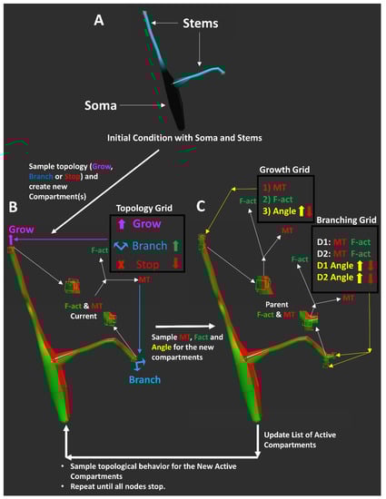 The tree generation process starts with the MT and F-actin quantities of the soma and the dendritic stem end points as the active compartments (Figure 4A). At each iteration, two sampling processes are carried out at every active compartment. The first sampling process (detailed in the Materials and Methods section) determines the topological fate (elongation, branching, or termination) of the active compartment based on its MT and F-actin quantities (Figure 4B). During this process, enriched F-actin increases the branching probability, while MT depletion increases the termination probability []. The second sampling process determines the cytoskeletal composition and orientation of each newly generated compartment (Figure 4C). Here, a decreased level of MT in the parent compartment leads to greater angular deviation. If a node elongates or bifurcates, the newly created compartments then become the new active compartments, and the sampling process iteration continues until all branches terminate. The same arbor generation model is employed for all 17 neuron groups.