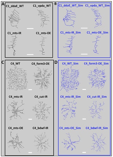 Morphological Comparison Between Real and Simulated Neurons. (A) Representative real neurons (black) from the four class I neuron groups (ddaE WT, vpda WT, vpda mts-IR, and vpda mts-OE). (B) Representative simulated neurons (blue) from the four class I neuron groups (ddaE WT, vpda WT, vpda mts-IR, and vpda mts-OE). (C) Representative real neurons (black) from six Class IV neuron groups (Class IV WT, form3-OE, mts-IR, cut-IR, mts-OE, and bdwf-IR). (D) Representative simulated neurons (blue) from six Class IV neuron groups (Class IV WT, form3-OE, mts-IR, cut-IR, mts-OE, and bdwf-IR). All scale bars (white rectangles) represent 100 µm.