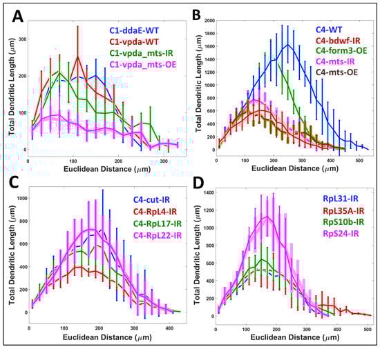 Drosophila stocks were reared at 25 °C on standard cornmeal-molasses-agar media. Age-matched wandering third instar larvae of both sexes were used for all experiments. Fly strains were obtained from Bloomington and the Vienna Drosophila Research Center. Fly strains used in the study included: UAS-GMA::GFP; GAL4[477], UAS-mCherry::Jupiter [] (Class IV cytoskeletal reporter strain); UAS-GMA::GFP;+;GAL4[221], UAS-mCherry::Jupiter (Class I cytoskeletal reporter strain) []; UAS-form3-B1 [], UAS-bdwf-IR (B27997), UAS-mts-IR (B57034), UAS-mts (B53709), UAS-ct-IR (B33965), UAS-RpL4-IR (v101346), UAS-RpL17-IR (v105376), UAS-RpL22-IR (v104506), UAS-RpL31-IR (v104467), UAS-RpL35A-IR (v100797), UAS-RpS10b-IR (v106323), UAS-RpS24-IR (v104676). Oregon R was used as a genetic background control for outcrosses to the multi-fluorescent cytoskeletal transgene reporters. We previously confirmed that expression of the F-actin and microtubules transgene reporters did not themselves exert any effects on dendritic development []. Virgin flies from either UAS-GMA; GAL4[221], UAS-mCherry::JUPITER, or UAS-GMA; GAL4[477], UAS-mCherry::Jupiter were crossed to gene-specific UAS-RNAi or UAS overexpression (OE) transgenic males. UP-TORR (www.flyrnai.org/up-torr/, accessed on 1 February 2023) was utilized to evaluate predicted off-target effects for gene-specific RNAi transgenes []; all RNAi lines used in this study have no predicted off-target effects. Live confocal imaging of mature da neuron Class I and Class IV arbors was performed as previously described [,,]. Briefly, larvae were placed on a glass slide and immersed in a 1:5 (v/v) diethyl ether to halocarbon oil and covered with a 22 × 50 mm cover slip.