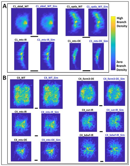 Average Arbor Density of Real and Simulated Neurons. (A) Arbor density averaged across all neurons from each group for Class I neuron types (ddaE WT, vpda WT, vpda mts-IR, and vpda mts-OE). Heatmaps for both real (left) and simulated (right) neurons are provided for each group. (B) Arbor density averaged across all neurons from each group for six Class IV neuron groups (WT, form3-OE, mts-IR, cut-IR, mts-OE, and bdwf-IR). Black scale bars below each real-simulated neuron pair represent 100 µm. Heatmaps for both real (left) and simulated (right) neurons are provided for each group, where yellow in the color bar represents high branch density and blue in the color bar represents low to zero branch density. The heatmaps for the 7 remaining Class IV neuron groups are included in Supplementary Materials Figure S2.