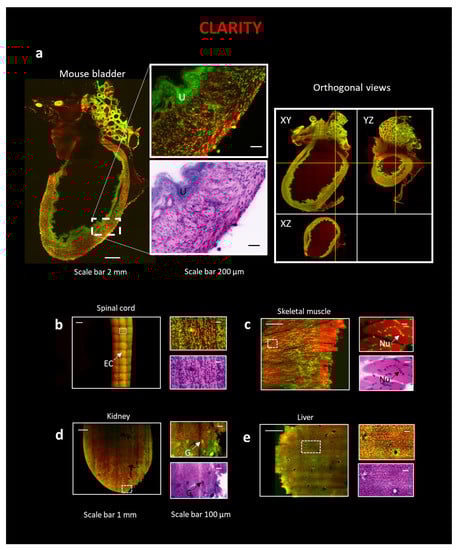 3D reconstruction of intact organs using the combination of CLARITY technique and LSM. (Left) All organs in the figure are stained with Eosin and SYTOX Blue. (Right) On the top of all images, a zoom-in on a particular region of interest (ROI) is represented, while on the bottom, the same ROI is converted with traditional H&E pseudo-coloration. The following organs are: (a) Mouse bladder, scale bar 2 mm, ROI, scale bar 200 µm. Orthogonal views of the intact mouse bladder. U—urothelium. (b) A portion of a slice of a mouse spinal cord, scale bar 1 mm, ROI, scale bar 100 µm; EC—Ependymal canal. (c) A portion of a slice of a mouse skeletal muscle, scale bar 1 mm, ROI, scale bar 100 µm. Nu—Nuclei. (d) A portion of a slice of a mouse kidney, scale bar 1 mm, ROI, scale bar 100 µm. G—Glomeruli. (e) Portion of a slice of a mouse liver, scale bar 1 mm, ROI, scale bar 100 µm.