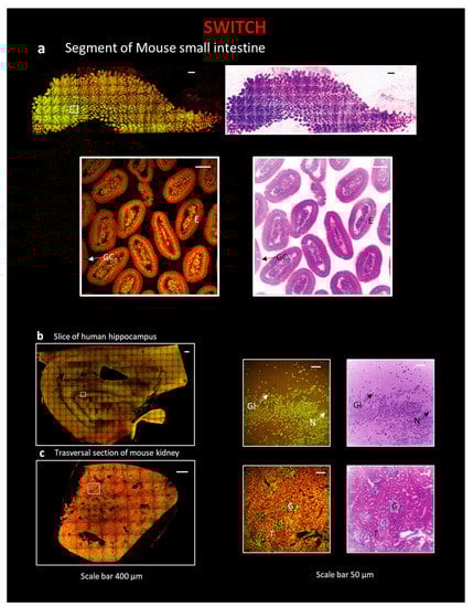 SWITCH [12] was selected to treat human samples, in particular, a ~500 µm-thick slice of a human hippocampus, for its compatibility with non-controlled fixation conditions [35,36] (Figure 1(b2)). We chose a thickness of 500 µm since our previous works demonstrated that this is the best dimension to be used to achieve optimal transparency with human brain samples. Indeed, the tissue autofluorescence, highly present in this kind of tissue, prevents the light from penetrating deeper into the sample, lowering the signal-to-background ratio and, thus, limiting the thickness of the section where it is possible to observe homogeneous staining [8,10,35,36]. Nevertheless, SWITCH is also suitable with mouse organ clearing [12]; therefore, we applied it also to a segment of a mouse small intestine and to a section of a mouse kidney. The SWITCH clearing process was followed by Eosin/DAPI staining and coupled with the TDE index-matching [35,36]. Samples were then imaged with Two Photon Fluorescence Microscopy (TPFM). As shown in Figure 3, after pseudo-coloration, a staining very similar to that of classical H&E is obtained. In particular, in the small intestine, the columnar epithelium (E) and goblet cells (GC) are evident (Figure 3a and Figure S1 and Video S1). In the human hippocampus, the large, round nucleus of neurons (N) with the nucleolus, and that of glial cells (Gl), which is smaller and with intensely colored heterochromatin (Figure 3b), were observed. In the kidney, glomeruli (G) and tubules (T) are clearly distinguished (Figure 3c).