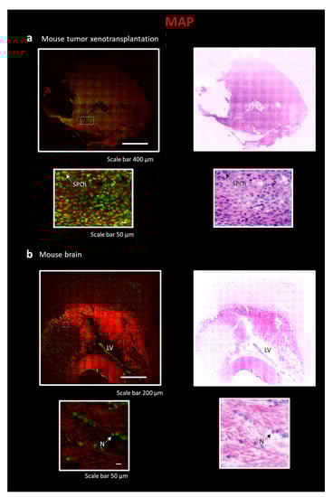 Reconstruction of tissue sections using the combination of MAP technique and LSM. All sections in the figure are stained with Eosin and SYTOX Blue, as described in Figure 2. On the top, entire sections are shown with traditional H&E fluorescent staining and pseudo-coloration. On the bottom, a particular region of interest (ROI) is represented. The following sections are: (a) Portion of a tumor xenotransplantation, scale 400 µm, ROI, scale bar 50 µm. SPCh—“salt and pepper chromatin”. (b) Slice of a mouse brain, scale 200 µm, ROI, scale bar 50 µm. LV—lateral ventricle; N—Neuron.