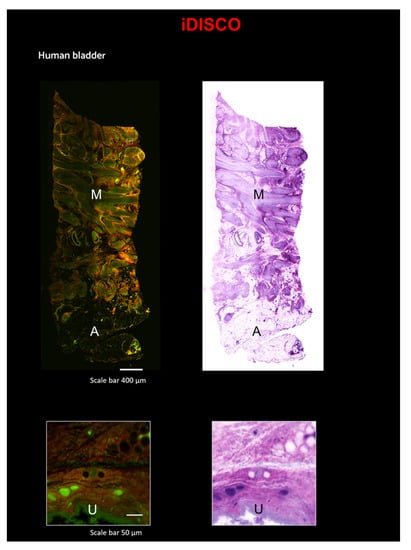 Here, we combined the iDISCO protocol with Eosin/SYTOX Blue Staining on a small sample of a human bladder (~0.5 × 0.5 × 2 cm3). Images were acquired with the custom LSM [33] (Figure 5 and Video S2). Additionally, with this technique, after pseudo-coloration, the staining is comparable to that of classical H&E (Figure 5). In the 3D reconstruction, portions of Adipose tissue (A) and of Muscularis propria (M) are evident. In the zoomed-in images, the urothelium (U) is clearly visible (Figure 5).