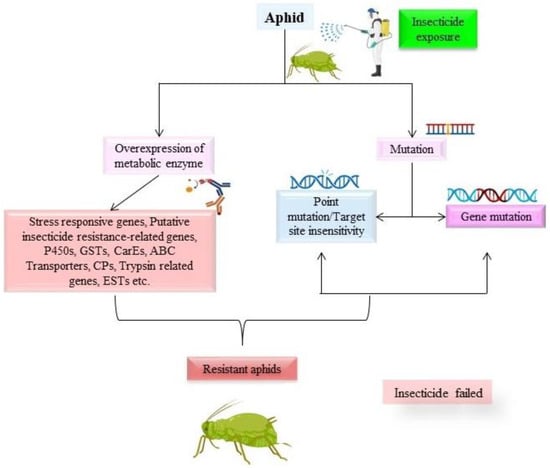 With the passage of time and indiscreet usage of insecticides on crops, aphids are becoming resistant to their effect. The different classes of insecticides, including organophosphates, carbamates, pyrethroids and neonicotinoids, have varied effects on insects. Furthermore, the molecular effects of these insecticides in aphids, including effects on the enzymatic machinery and gene mutation, are resulting in aphid resistance to the insecticides. In this review, we will discuss how aphids are affected by the overuse of pesticides, how resistance appears, and which mechanisms participate in the resistance mechanisms in various aphid species as significant crop pests. Gene expression studies were analyzed using the RNA-Seq technique. The stress-responsive genes were analyzed, and their expression in response to insecticide administration was determined. Putative insecticide resistance-related genes, cytochrome P450, glutathione S-transferase, carboxylesterase CarEs, ABC transporters, cuticle protein genes, and trypsin-related genes were studied. The review concluded that if insecticide-susceptible aphids interact with ample dosages of insecticides with sublethal effects, this will result in the upregulation of genes whose primary role is to detoxify insecticides. In the past decade, certain advancements have been observed regarding insecticide resistance on a molecular basis. Even so, not much is known about how aphids detoxify the insecticides at molecular level. Thus, to attain equilibrium, it is important to observe the manipulation of pest and insect species with the aim of restoring susceptibility to insecticides. For this purpose, this review has included critical insights into insecticide resistance in aphids.