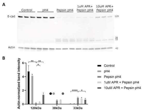 Western blot (A) analyzed by densitometry (B) showed that acidified pepsin elicited E-cadherin cleavage via regulated intramembrane proteolysis (RIP), producing C-terminal intracellular fragments of 33 and 38 kDa. Acid alone did not cause E-cadherin RIP. 10 µM amprenavir partially rescued E-cadherin RIP, with increased full-length E-cadherin and decreased 33 and 38 kDa fragments compared to acidified pepsin, whereas 1 µM amprenavir resulted in a slight increase in full-length E-cadherin only. Dots represent samples for which no bands were detected. Where significant and where bands were detectable for analysis, the following comparisons are shown: control vs. pH4, control vs. pepsin pH4, pepsin pH4 vs. +1 µM APR, and pepsin pH4 vs. +10 µM APR. * = p < 0.05, ** = p < 0.01, **** = p < 0.0001.
