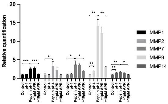 Expression of MMPs following mock treatment, treatment with acidified pepsin ±1 or 10 µM amprenavir, or acid alone. Where significant, the following comparisons are shown: control vs. pH4, control vs. pepsin pH4, pepsin pH4 vs. +1 µM APR, and pepsin pH4 vs. +10 µM APR. * = p < 0.05, ** = p < 0.01, *** = p < 0.001.