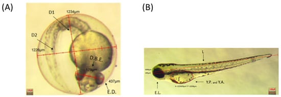 To verify the possible interference of the two chemicals on the early developmental phases, the embryo and larvae were observed daily, starting just prior to hatching and using a stereomicroscope at 48, 72, and 96 h post-fertilization (hpf). At 48 hpf, the two eye diameters (D), the eye distance (E.D.), and the distance between the eyes (D.B.E.) were checked. At 72 and 96 hpf, the length of the larvae (L), the length of the eyes (E.L.), the yolk area (Y.A.), and its perimeter (Y.P.) were recorded. Figure 1A,B show representative images and details regarding the morphological parameters.