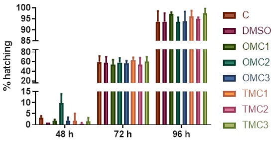 The hatching rate was monitored daily starting from 48 hpf. At 48 h, in OMC2-exposed embryos, the hatching rate was higher, although not to a significant extent with respect to all the other experimental groups. At 72 hpf, the hatching rate reached 60% and was similar in all groups. At 96 hpf, more than 90% of the embryos were hatched in all groups, and no statistical significances were observed among the experimental fish (Figure 2).