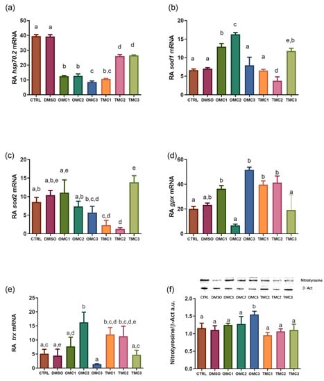 Regarding sod2, the mRNA transcript increased in TMC3-treated fish. In contrast, a decrease, although not statistically significant with respect to the controls, was observed in OMC2 and OMC3 larvae. Nevertheless, the TMC1 and TMC2 concentrations caused a significant mRNA reduction (Figure 4c). The glutathione peroxidase (gpx1a) mRNA levels pinpointed significant differences among the exposed and control groups. Specifically, regarding treatments, in OMC-exposed fish, a U shape response was observed, with an increase induced by the lowest and highest concentrations, while the medium one did not affect the basal levels. Concerning TMC, only TMC1 and TMC2 exposure upregulated mRNA expression, with values similar to those induced by OMC1 and OMC2 concentrations (Figure 4d). Thioredoxin (Trx) mRNA expression was significantly upregulated only in OMC2, TMC1, and TMC 2-exposed larvae. Furthermore, in OMC1-treated fish, a slight increase was observed, although not statistically significant (Figure 4e). By a Western blot analysis, the nitrotyrosine (NT) protein levels were assayed. A significant upregulation of the protein levels was observed only in OMC3-treated fish. Noteworthy is the decreasing, although not significant, trend displayed by the TMC treatments (Figure 4f).
