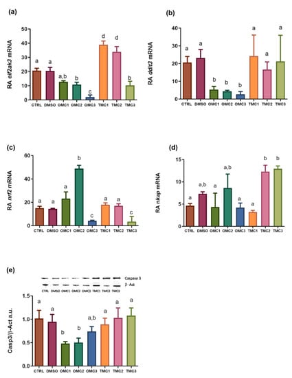 Among the molecular sensors triggering the onset of ER stress, eif2ak3 mRNA (codifying for PERK protein) was significantly downregulated in larvae exposed to OMC2, OMC3, and TMC3, while it was upregulated in larvae exposed to TMC1 and TMC2 (Figure 5a). The expression of DNA damage-inducible transcript 3 (ddit3), also known as the C/EBP homologous protein (CHOP), significantly decreased in all groups exposed to OMC (Figure 5b). Nuclear receptor factor 2 (nrf2) mRNA resulted in significantly upregulated in OMC2 exposed larvae and downregulated OMC3 and TMC3 groups (Figure 5c).