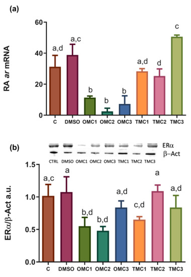 The Ar transcript levels were significantly downregulated by OMC exposure, while the TMC treatment did not induce significant changes either with respect to the DMSO-treated or to CTRL fish (Figure 6a). By a Western blot analysis, the Erα protein levels were analyzed, and a significant reduction was observed in OMC1- and OMC2-treated larvae, while TMC1 exposure caused a significant downregulation only with respect to DMSO-exposed larvae (Figure 6b).