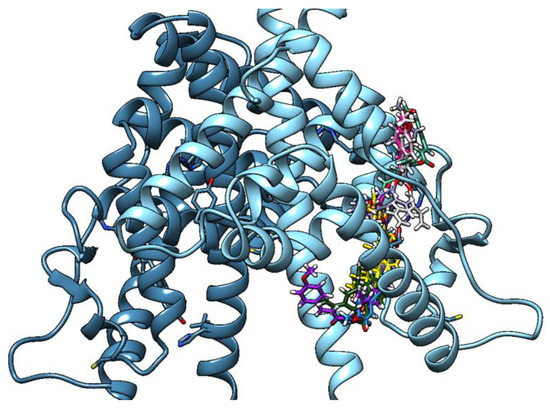 Estrogenic receptor: for TMC, from the cluster analysis, only one main pose was identified (three clusters; >90% population) located within the estradiol binding cleft (En = −7.74 kcal/mol) (Figure 7). Comparing this positioning with the estradiol and raloxifene ones (derived from crystallographic data 1a52 and 1ere, respectively), we can notice that they are totally superimposable, thus suggesting a competitive binding behavior. However, the estradiol binding energy is much lower (i.e., higher affinity) at −9.68 vs. −7.74 kcal/mol, implying that TMC cannot really compete significatively with the natural ligand (no interference activity).