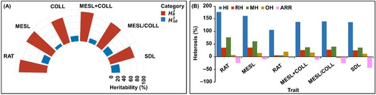The broad-sense heritability () and genotype × environment interaction heritability ( ), and heterosis for six deep-sowing traits including emergence rate (RAT), mesocotyl length (MESL), coleoptile length (COLL), total length of mesocotyl and coleoptile (MESL + COLL), length ratio of mesocotyl to coleoptile (MESL/COLL), and seedling length (SDL). Multi-angle radar map of and for the six traits was prepared using the Genescloud tool (https://www.genescloud.cn; accessed on 12 December 2022) (A). Heterosis, including F1 heterosis index (HI), relative heterosis (RH), mid-parent heterosis (MH), over-parent heterosis (OH), and F2:3 advantage reduction rate (ARR) of these six traits (B).
