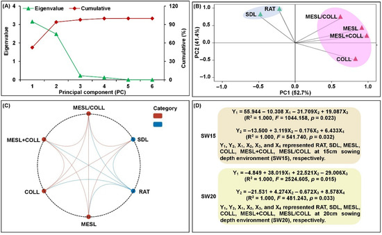 Framework relations based on principal component analysis (PCA), Pearson pairwise correlations, and multiple linear regression analysis among six deep-sowing tolerant traits, emergence rate (RAT), mesocotyl length (MESL), coleoptile length (COLL), total length of mesocotyl and coleoptile (MESL + COLL), length ratio of mesocotyl to coleoptile (MESL/COLL), and seedling length (SDL), at three sowing depth (3 cm, 15 cm, and 20 cm) environments. Eigenvalues and cumulative variance of principal components (PCs) (A). The effects of six deep-sowing tolerant traits in PC1 and PC2 (B). Interactive ring correlation diagram among six deep-sowing tolerant traits at the sowing depths of both 15 cm and 20 cm, prepared using the Genescloud tool (https://www.genescloud.cn; accessed on 12 December 2022) (C). Multiple optimal linear regression equations of six deep-sowing tolerant traits at 15 cm and 20 cm treatments were constructed using IBM-SPSS Statistics v.19.0 (SPSS Inc., Chicago, IL, USA; http://www.ibm.com/products/spss-statistics; accessed on 10 July 2022) (D).