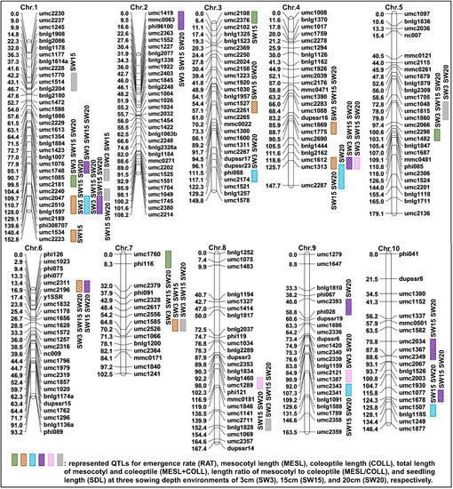 Previously, we used 253 genome-wide polymorphic simple sequence repeats (SSRs) for genotyping the F2 indivuals to construct a genetic linkage map, which spanned a total length of 1410.6 cm with an average interval of 5.6 cm between markers [21]. Subsequently, we detected QTLs using a composite interval mapping (CIM) approach and the threshold logarithm of odds (LOD) score of 3.00 (p < 0.05) in Windows QTL Cartographer software v.2.5 (https://brcwebportal.cos.ncsu.edu/qtlcart/WQTLCart.htm; accessed on 21 July 2022). We identified 33 QTLs for six deep-sowing tolerant traits (four for RAT, seven for MESL, five for COLL, eight for MESL + COLL, three for MESL/COLL, and six for SDL) in the F2:3 population at three sowing depths, which were distributed over the ten chromosomes; phenotypic variation explained (PVE) within each sowing environment by these QTLs were 2.89% (qMESL–Ch.1–1 at 3 cm environment)—14.17% (qSDL–Ch.7–1 at 20 cm environment) (Figure 3; Table S1). The QTLs for RAT, MESL, COLL, MESL + COLL, and SDL displayed both additive and non-additive effects, including partial-dominance, dominance, and over-dominance, whereas the QTLs for MESL/COLL only showed non-additive effects (Table S1). In addition, we detected only one major QTL (qMESL–Ch.1–2) under a single environment (PVE > 10%), and other 12 major QTLs under two or more environments (Table S1; Figure 3). Of them, qMESL–Ch.1–1 (PVE, 2.89–10.01%), qCOLL–Ch.1–1 (PVE, 10.38–14.12%), and qMESL + COLL–Ch.1–2 (PVE, 5.80–9.37%) were simultaneously located in the Bin 1.09 (umc2047–bnlg1597) region; qMESL/COLL–Ch.4–1 (PVE, 8.43–10.69%), qMESL + COLL–Ch.4–1 (PVE, 4.08–9.40%), and qMESL–Ch.4–2 (PVE, 6.98–8.42%) were simultaneously located in the Bin 4.08 (umc1612–umc1313) region; qMESL–Ch.6–1 (PVE, 5.06–10.03%) and qMESL + COLL–Ch.6–1 (PVE, 5.81–8.15%) were simultaneously located in the Bin 6.01 (umc2311–umc2196) region; qSDL–Ch.7–1 (PVE, 6.26–14.17%); and qMESL–Ch.7–1 (PVE, 3.67–4.93%) were simultaneously located in the Bin 7.02 (umc1585–umc2526) region (Table S1; Figure 3). These findings confirmed that the four major QTLs regions, i.e., Bin 1.09, Bin 4.08, Bin 6.01, and Bin 7.02 had pleiotropic effects on multiple deep-sowing tolerant traits, including MESL, COLL, MESL + COLL, MESL/COLL, and SDL in maize.