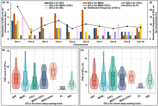 Summary of original QTLs information for seven deep-sowing tolerant traits, emergence rate (RAT), mesocotyl length (MESL), coleoptile length (COLL), total length of mesocotyl and coleoptile (MESL + COLL), length ratio of mesocotyl to coleoptile (MESL/COLL), plumule length (PL), and seedling length (SDL). Distribution of QTLs on ten chromosomes (A), logarithm of odds (LOD) scores of QTLs (B), and phenotypic variance (PVE) of QTLs (C) for seven deep-sowing tolerant traits.