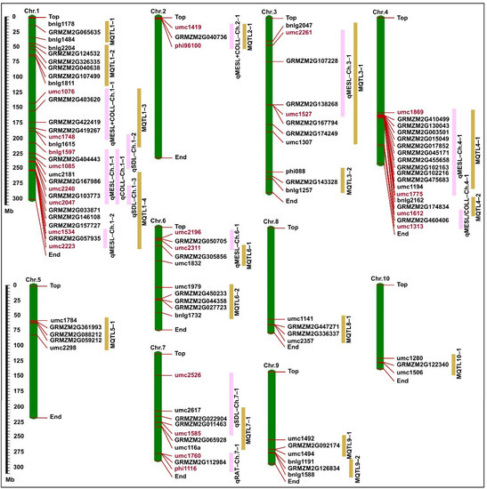 The physical map was constructed according to B73 RefGen_v3 physical map (https://www.maizegdb.org/genome/assembly/B73%20RefGen_v3; accessed on 10 December 2022); the distributions of major QTLs, meta-QTLs (MQTLs), and candidate genes in the physical map were performed using MapInspect 1.0 software (https://mapinspect.software.informer.com; accessed on 13 December 2022). Pink pillars represent corresponding major QTLs regions in our F2:3 population (vermilion markers represent the two side markers of corresponding major QTLs), and earthy yellow pillars represent MQTLs regions.