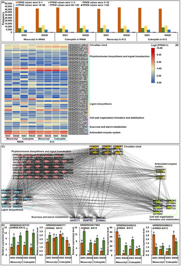 Gene expressions as the fragments per kilobase of transcript per million mapped read (FPKM) values in mesocotyl and coleoptile of both parents (W64A and K12) at 3 cm (SW3) and 20 cm (SW20) sowing depths via RNA-sequencing (RNA-Seq) (A). The expression profiles of candidate genes in mesocotyl and coleoptile of both parents that were performed using TBtools software (https://github.com/CJ-Chen/TBtools/releases; accessed on 21 December 2022) (B). The interactome networks among all candidate genes were constructed using Cytoscape 3.8.2 (https://cytoscape.org/download.html; accessed on 26 December 2022) (C). Relative expression level of five candidate genes in mesocotyl and coleoptile of both parents at SW3 and SW20 sowing environments, and different lowercase letters over mesocotyl or coleoptile of both parents at a single environment indicate significant differences at p < 0.05 (ANOVA) (D).