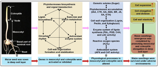 The elongation of mesocotyl and coleoptile of maize at deep-sowing stimulations can be closely related to some physiological responses. A large amount of evidence has been confirmed that phytohormones are crucial internal regulators that affect the length of mesocotyl and coleoptile. Zhao and Zhong [3] reported that 20 cm deep-sowing stress increased indole-3-acetic acid (IAA), Cis-zeatin (Cis-ZT), trans-zeatin (Trans-ZT), 24-epibrassinolide (EBR), and abscisic acid (ABA) accumulation in both mesocotyl and coleoptile of four maize genotypes. These phytohormones are vital for plant development in which IAA promotes cell enlargement of mesocotyl [32], ABA promotes cell elongation of hypocotyl [33], brassinosteroid (BR) promotes cell elongation and division of both mesocotyl and coleoptile [13,14], and cytokinin (CTK) promotes cell division of mesocotyl [34]. In contrast, Feng et al. [35] found that light irradiation inhibited mesocotyl elongation of rice with a concomitant increase in jasmonic acid (JA) level, and a decrease in IAA and gibberellin 3 (GA3) as well as Trans-ZT contents. It is likely that JA was involved in light-dependent regulation of mesocotyl elongation [35]. The mutants impaired in JA biosynthesis had a longer mesocotyl phenotype confirmed the negative role of JA in mesocotyl elongation [36]. Lignin is the main component of secondary cell walls and is directly related to the degree of cell wall elasticity. Cell wall relaxation and cell elongation are negatively affected by increasing lignin levels [37]. Phenylalanine ammonia-lyase (PAL), cinnamyl alcohol dehydrogenase (CAD), trans-cinnamate 4-monooxygenase (C4H), 4-coumarate-CoA ligase (4CL), and peroxidase (POD) all play major roles in lignin biosynthesis [38]. PAL is the first enzyme of the general phenylpropanoid pathway that deaminated phenylalanine to trans-cinnamic acid [39]. During cell wall lignification, the H2O2 induced POD catalyzed the oxidative dehydrogenation of monolignols (hyproxyphenyl-, guaiacyl-, and syringyl-unit), which led to free radical polymerization to produce lignin [40]. Zhao and Zhong [3] showed that the decrease in PAL, POD, superoxide dismutase (SOD), catalase (CAT), and ascorbate peroxidase (APX) activities in mesocotyl and coleoptile under 20 cm deep-sowing stress reduced lignification, which subsequently accelerated mesocotyl and coleoptile elongation in maize. Targeted metabolomics using ultra-high-performance liquid chromatography-tandem mass spectrometry (UPLC-MS/MS) also showed that some intermediate metabolites of lignin biosynthesis, including p-coumaraldehyde, p-coumaryl alcohol, and sinapaldehyde, in mesocotyl of two maize inbred lines were down-regulated at 20 cm of the deep-sowing environment [41].