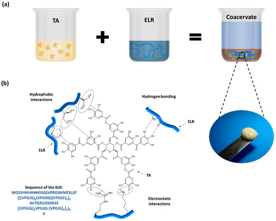(a) Preparation of ELR + TA bioadhesive and coacervate formation. (b) Schematic of the potential interactions between ELR and TA.