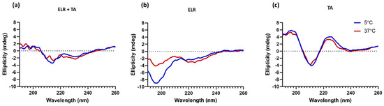ELR, TA, and ELR+TA were dissolved at 1 mg/mL in ultrapure water (5 °C) and diluted to a final concentration of 0.1 mg/mL immediately before the circular dichroism (CD) analysis. The CD measurements were performed in 1-mm path-length quartz cuvettes using a Jasco J-810 spectropolarimeter (Jasco, Easton, MD, USA) equipped with a temperature controller (Research Technical Services, University of Alicante, Spain). The signals were scanned over a range of 260–190 nm with a data pitch of 0.5 nm. All measurements were carried out in triplicate. Data were smoothed for representation using a second order smoothing (average of 5 neighbors).