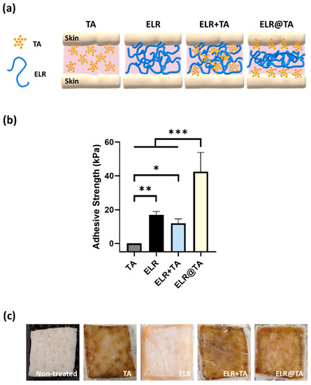 Evaluation of the adhesiveness of ELR-based bioadhesives on skin tissues. (a) Schematic representation of ELR-based bioadhesives on skin tissue. (b) Adhesive strength on porcine skin of the different formulations (10% TA, 10% ELR, 10% ELR + 10% TA, and 10% ELR @ 10% TA) (* p < 0.05, ** p < 0.01, *** p < 0.001). (c) Photographs of the skin before and after testing with the different formulations.