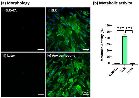 Cell viability was evaluated using an indirect cytotoxicity test following standard ISO-10993-12:2019 [52]. Briefly, SMCs were fed with the extracted media obtained from (i) 10% ELR + 10% TA, (ii) 10% ELR, (iii) 10% ELR + 10% SF, and (iv) 10% SF. Latex (6 cm2/mL) and DMEM were used as positive and negative controls, respectively.