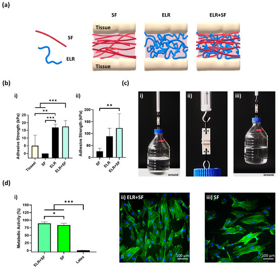 In the bone tissue (Figure 6(bii)), the adhesion strength was one order of magnitude greater than on the skin for all formulations. This may reflect the different properties of the tissues and the drying of the protein adhesive that could promote the formation of physical entanglements of the protein polymers on the tissue surface. It was remarkable that the ELR and ELR + SF formulations achieved adhesiveness values of 88.8 ± 33.2 kPa and 123.3 ± 60.2 kPa, respectively. Thus, the composite formulation improved the adhesiveness of the bioadhesive. This may be due to the additive effect of two factors. SF has the ability to self-assemble into highly stable beta-like structures, which will contribute to increasing the cohesive forces within the ELR-based adhesive; however, in addition, SF has a high content of amino acids, with groups capable of forming hydrogen bonds with the tissue surface, such as hydroxyl groups (Ser (~12%) and Tyr (~5.5%)) and carboxyl groups (Asp and Glu (~1.5%)), which appear to contribute to increasing the adhesive properties of the bioadhesive. For a better demonstration of the adhesion power of this formulation, we applied it to a 2.5 cm2 bone tissue surface and we were able to lift 2 kg (Figure 6(ci–iii)). Additionally, good metabolic activity (90.4% ± 6.7, Figure 6(di)) and well-spread morphology (Figure 6(dii)) were observed with the ELR + SF formulation. The bioadhesive ELR + SF shows not only adhesive properties comparable to other very promising adhesives (Table S5, Supplementary Materials), but it does so with a very simple formulation, avoiding the use of any harmful components that could otherwise compromise the biomedical application. The composite bioadhesive showed encouraging results regarding adhesiveness and cell viability, which sets the basis for the future and necessary validation of the bioadhesives in in vivo settings.