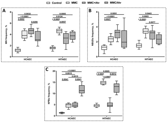The frequency of all studied cytogenetic indicators, except the NPBs frequency in the MMC+Atv treated HCAEC, was significantly higher in comparison with the non-exposed control.