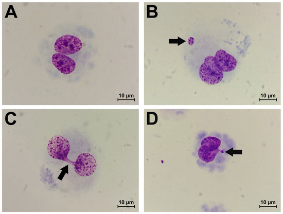 Morphology of undamaged BN endothelial cell (A), BN cell with MNi (B), BN cell with NPB (C), and BN cell with NBUD (D) at 1000× magnification (BN, binucleated; MNi, micronuclei; NPB, nucleoplasmic bridge; NBUD, nuclear bud).