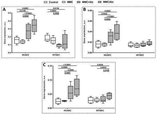 Expression of DDB1 (A), ERCC4 (B), and ERCC5 (C) in endothelial cells (MMC, mitomycin C; Atv, atorvastatin; HCAEC, human coronary artery endothelial cells; HITAEC; human internal thoracic endothelial cells; MN, micronuclei; NBUDs, nuclear buds; NPBs, nucleoplasmic bridges).