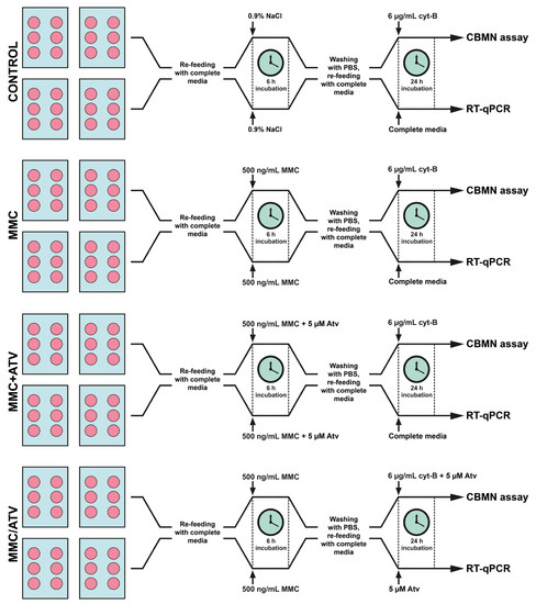Experimental design of the study (PBS, phosphate buffered saline; cyt-B, cytochalasin B; CBMN assay, cytokinesis-block micronucleus assay; RT-qPCR, quantitative reverse transcription polymerase chain reaction; MMC, mitomycin C; Atv, atorvastatin).