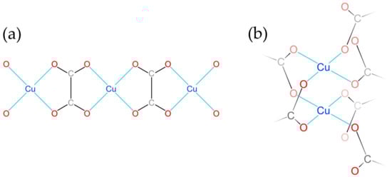 To the best of our knowledge, the first two possible structural models of copper oxalate were proposed by Dubicki et al. [] after studying its magnetic properties. The first model consists of isolated chains of copper ions in a square-planar geometry connected successively via oxalate molecules (Figure 1a). The second model suggested the framework structure where each Cu2+ cation is connected to four oxalate molecules (Figure 1b).