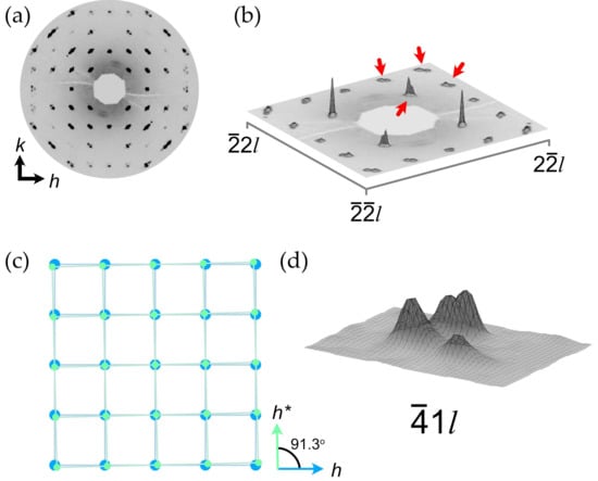 With the increase in the 2θ angle, additional satellite reflections start to appear more legibly (Figure 3d). The appearance of satellite reflections is probably due to the presence of additional domains that make a smaller contribution, and thus, their assignments were unsuccessful.