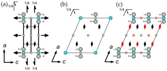 Calculations were conducted using DISCUS software implemented via the DISCUS Suite program package [,,]. The simulating mechanism was based upon direct Monte Carlo calculations. Calculations were conducted using the energy coefficient Jn, which stands for interaction energies, where the value of 1.0 means that the desired Monte Carlo move is energetically unfavorable and −1.0 means that a move is energetically favorable. Although we use energy as the definition of the desired Monte Carlo moves, the final result is given in correlation coefficients for the sake of clarity. Detailed descriptions of the method can be found in Refs. [,,]. In order to simplify the simulation process, the origins of unit cells of the MC2 models were shifted using the 0.25a + 0.25b + c vector. A final simulated precession image of the hk1 lattice plane was drawn on the basis of a constructed fragment of a 2D crystal of 500 × 500 × 1 unit cells. In order to obtain a smooth noiseless image, Fourier calculations were conducted using 100 lots (randomly chosen subregions of 50 × 50 × 1 unit cells) assuming the periodic boundary condition. The h0l image was obtained on the basis of 200 × 40 × 200 unit cells and 100 lots of 20 × 20 × 40 unit cells. Bragg scattering was determined as 1% of the crystal subtracted from the resulting images in both cases. The resulting precession images, as well as the schematic illustrations of the crystal representing the used correlation vectors, were drawn using KUPLOT software [].