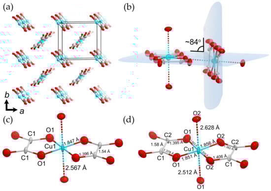 The fundamental building unit of the moolooite structure is the Cu–(C2O4)–Cu chain arranged along the [001] direction (Figure 6a). The chains are inclined at ~84o to each other (calculated as the angle between mean planes drawn through O atoms of each chain) and form the infinite framework via elongated Cu–O bonds between adjacent chains (Figure 6b). On the other hand, Fichtner-Schmittler [] described such stacking in terms of the OD theory, asserting that the chains connected via Cu–O form crossed layers that are coplanar with the (110) and () planes. Therefore, the overall structure can be described as a conditional “polytype”.