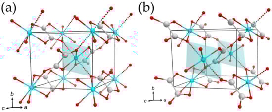The crystal structures of the MC2a model (a) and MC2b model (b). Cu atoms at the center of the unit cells are showed within CuO6 octahedra. Legend: same as that in Figure 6.