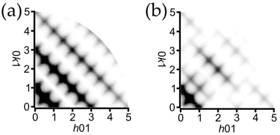 Thus, sublattices formed by C and O atoms should contribute to the h + k = 2n + 1 scattering, which is absent in Figure 8d. It is of interest that the h + k = 2n streaks related to the scattering caused by the sublattice formed by C atoms are actually present, but the resulting intensity is too low compared to that of the scattering from Cu atoms (see Figure 9). However, the intensity of the h + k = 2n streaks should be amplified by the scattering from the sublattice formed by O atoms, which occupy general sites as well, and which is not observed in the simulated pattern. The most likely explanation is that O atoms form an ordered sublattice, which contributes to the Bragg scattering only. This assumption is confirmed by the fact that O atom sites in both the MC2a and MC2b models are the same, and thus, O atoms are ordered throughout the whole structure. If the same simulation is made using the models suggested by Christensen et al. [], in which O atoms occupy different sites in both models, weak h + k = 2n streaks are clearly evident at h + k = 2 and h + k = 4, but the crossing of both sets of diffuse streaks is observed at (0.5, 1.5, l), (1, 1, l) and (1.5, 2.5, l) (l = 1) (Figure 8e). Thus, we can conclude that the presence of h + k = 2n streaks at the observed diffraction patterns (Figure 4b and Figure 8c) depends on the combined disorder of sublattices formed by C and O atoms. At the same time, the whole set of H ± * streaks reflects the presence of disorder, which is caused by the disorder of sublattices in combination with the correlated disorder along the * vector.