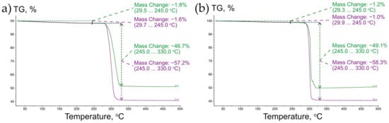 Thermal decomposition of SM powder samples that were synthesized at room temperature (a) and at 60 °C (b); see Section 4.1 for details. Legend: heating in inert (violet) and oxidizing (green) atmosphere.