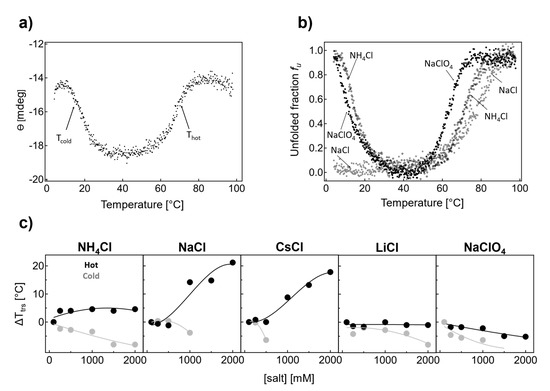 Figure 2c). Increasing the CsCl concentration significantly increased the transition temperature. At the same time, the threshold for cold denaturation shifted toward lower temperatures, and the cold denaturation process was not visible anymore above 0.5 M CsCl.