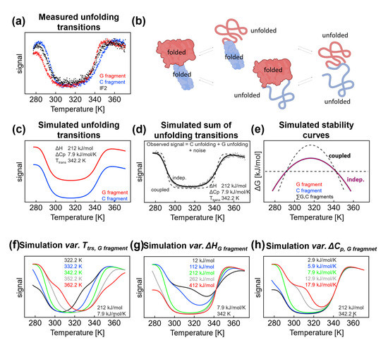 Figure 3f): We examined how the thermal profiles of independently unfolding fragments can be resolved and how they affect the apparent two-state character of thermal curves. The denaturation parameters for the C fragment were held constant (Δ