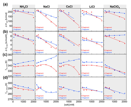 4 had the lowest slope values. The profile of salt-specific slopes was similar for G and C fragments. In summary, the analysis showed that the change in denaturation enthalpy was dependent on the type of cation and anion, and denaturation enthalpy was more highly dependent on salts for the G fragment than the C fragment.