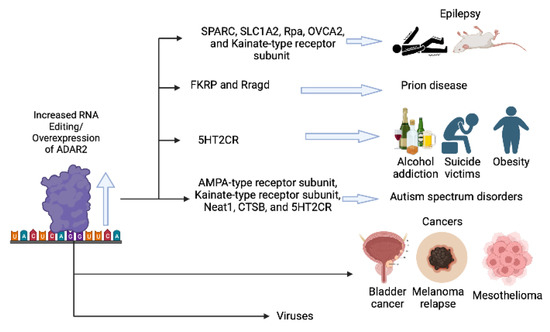Schema representing the mechanism of ADAR2 overexpression (or increased RNA editing) and the associated diseases. The figure was created using BioRender (https://biorender.com/ accessed on 30 March 2023).